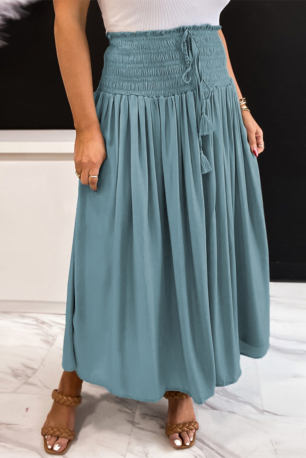 Green Drawstring Smocked High Waist A-line Skirt