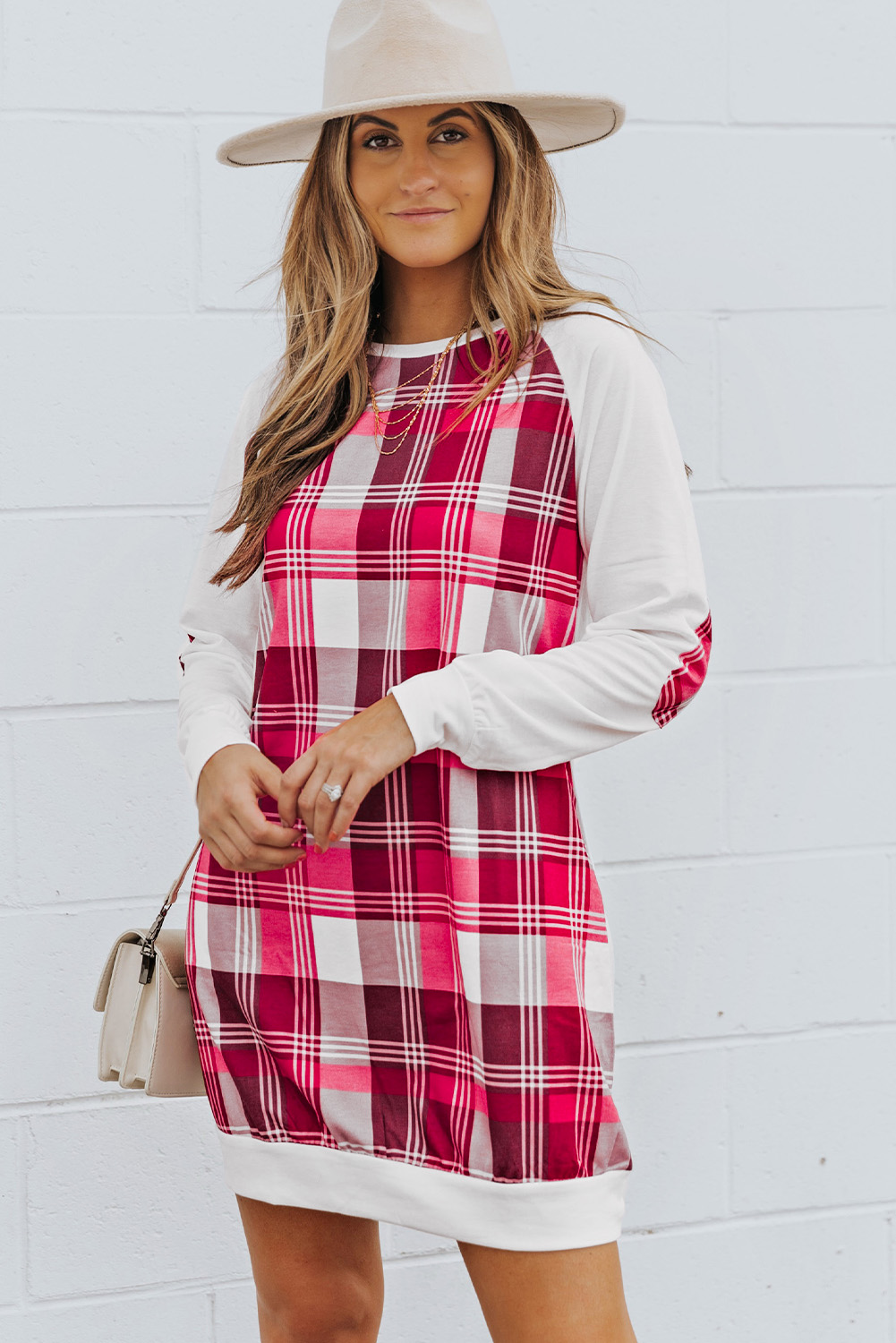 Pink Long Sleeve Plaid Patchwork Shift Dress