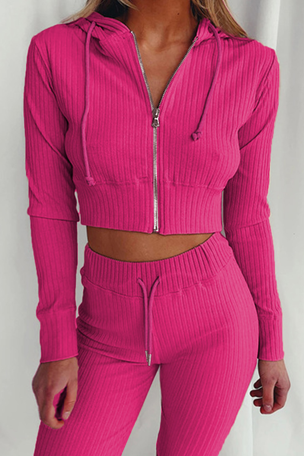 Pink Ribbed Knit Cropped Hoodie and Jogger Two Piece Set
