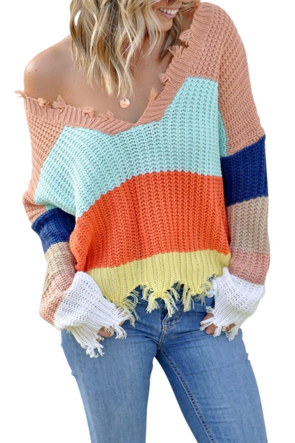 Drop-Shoulder Sleeve Striped Patchwork Pullover Sweater