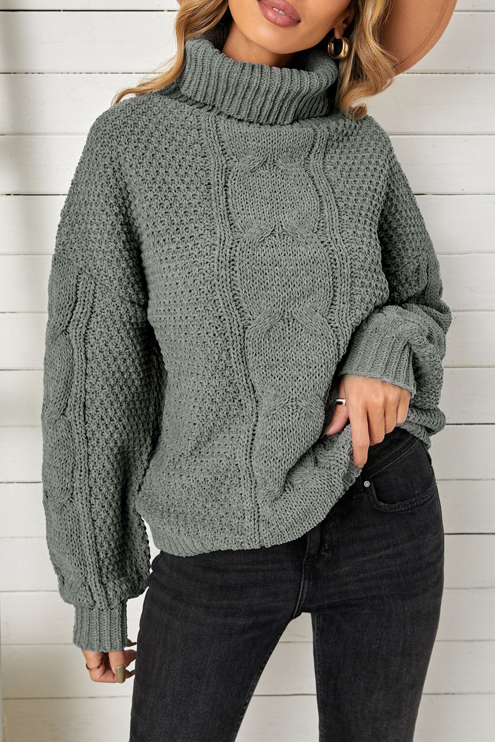 Gray Solid Turtleneck Cable Knit Pullover Sweater